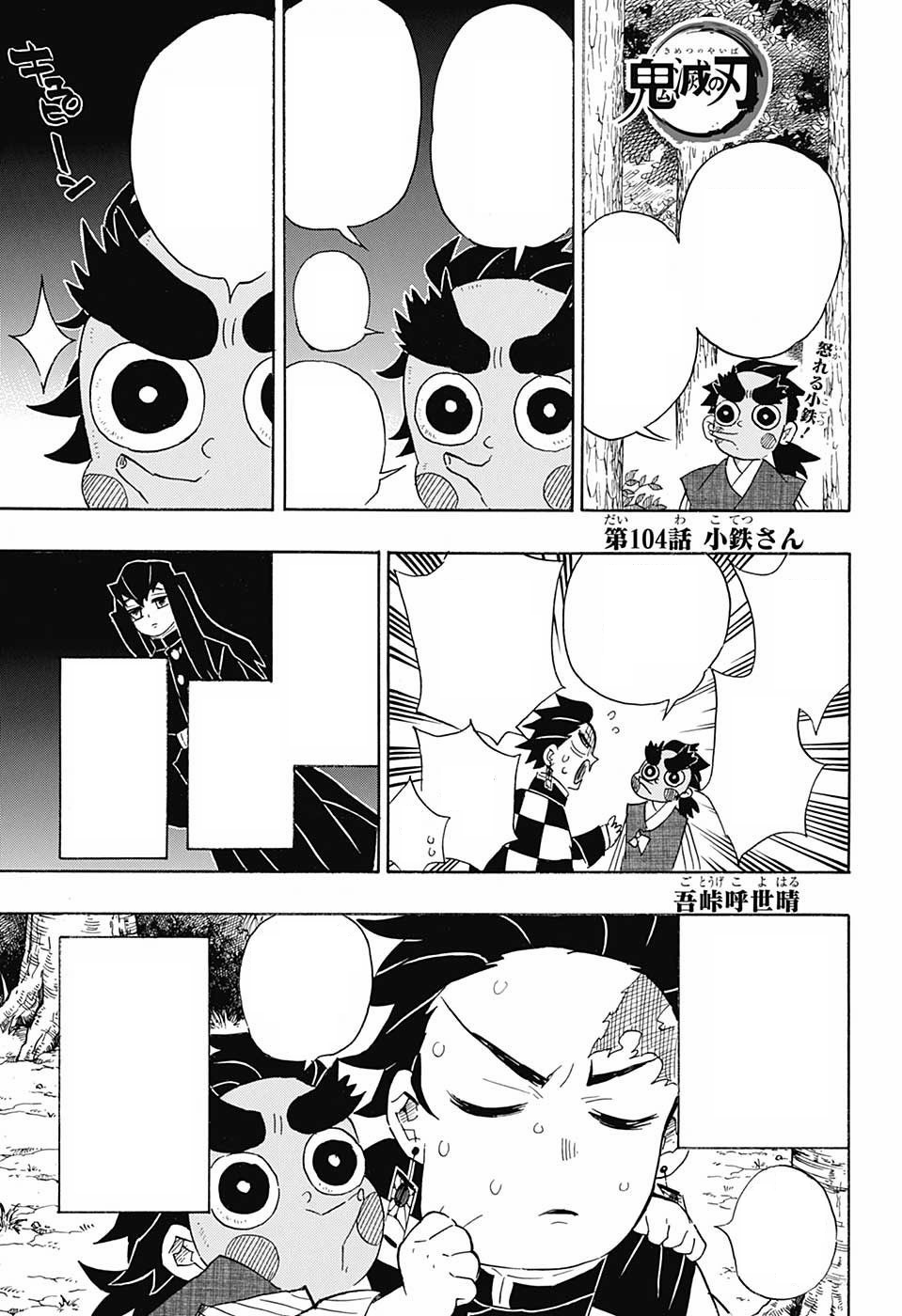 With Kotetsu's approval obtained, Tanjiro succeeds in landing a blow to the doll’s neck and breaks his training sword in the process. He apologizes to Kotetsu for the ruined sword and, after Kotetsu's sudden exclamation, Tanjiro turns to see a sword’s hilt emerging from the doll’s body where its head used to be.