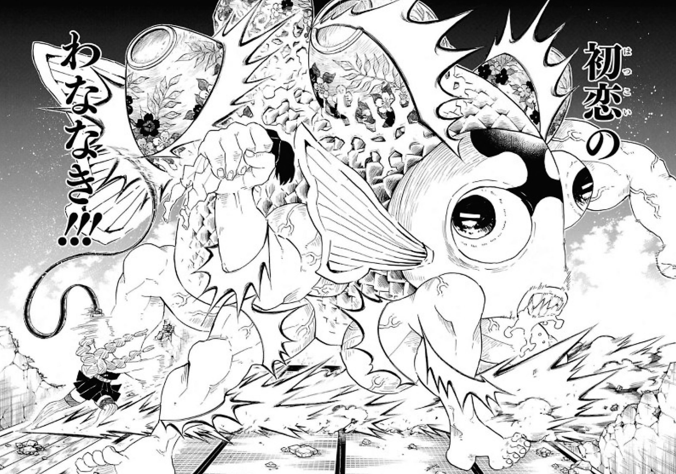 At Tecchin's location, a swordsmith tries to save him from being crushed by a fish Demon, but his injuries render him unable to move. Mitsuri appears before him and instructs him to stay still to prevent his injuries from becoming worse. The Love Hashira then attacks with Love Breathing First Form: Shivers of First Love, slicing the Demon and making it release the chief. After defeating it, Mitsuri angrily mutters how those who hurt others will never make her heart throb.