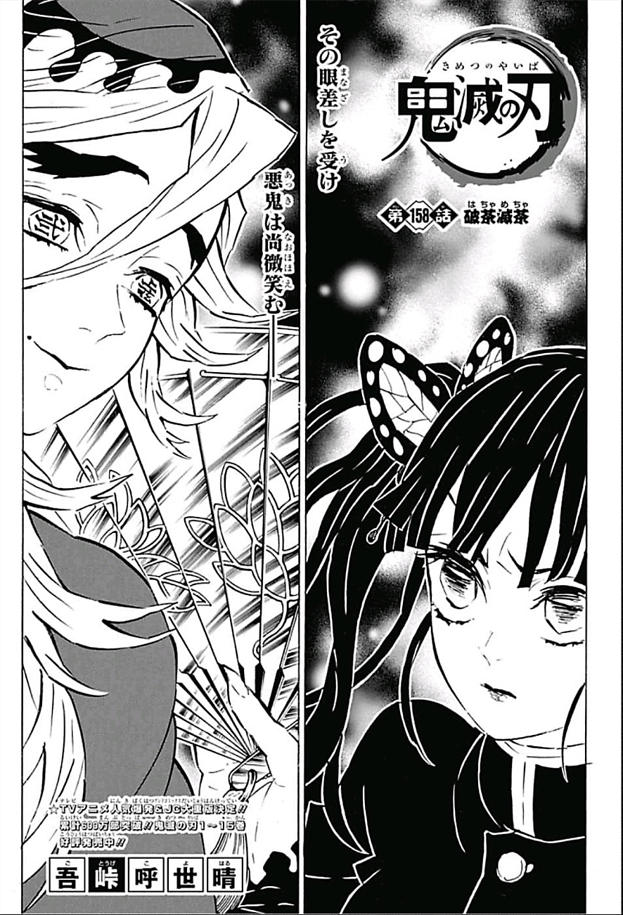 Chaos (破 (は) 茶 (ちゃ) 滅 (め) 茶 (ちゃ) , Chaos?) is the one hundred and fifty-eighth chapter of Koyoharu Gotōge's Kimetsu no Yaiba.