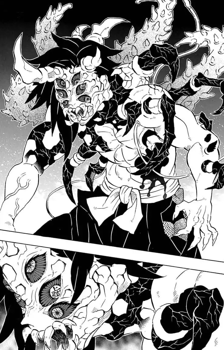 The Upper Rank manages to dodge Gyomei's axe and slices off Muichiro's sword hand. He attempts to pull out the boy's blade and also remove the stump Genya summoned on him. Kokushibo's head slowly begins to regenerate as he continues to evade strikes from Gyomei and Sanemi. Much to their shock he manages to fully regrow a new head but it is far more monstrous than what he had before.