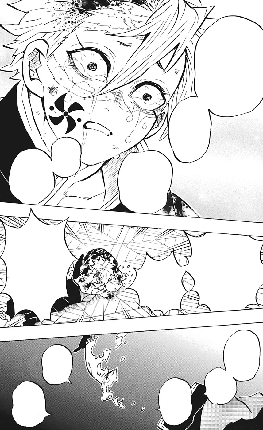 Kokushibo disintegrates entirely but Sanemi Shinazugawa continues to blindly charge at him and Gyomei Himejima has to stop the Wind Hashira, telling him the fight is over. He is shocked to see that Sanemi is in fact unconscious and had been attacking the Upper Rank in that state.