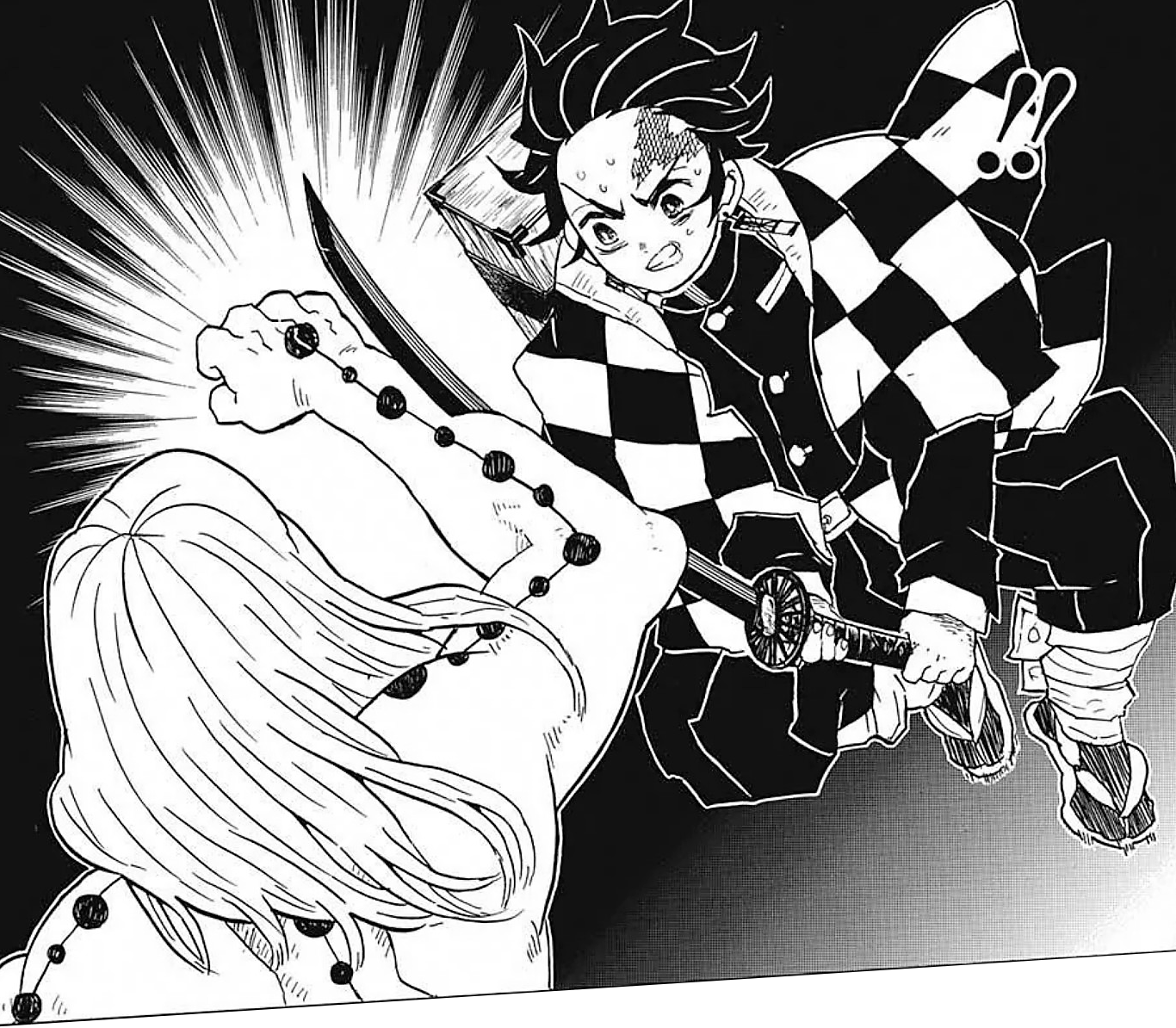 The scene returns back to Tanjiro falling from the sky, as he approaches the ground, he uses Water Breathing: Second Form - Water Wheel to soften his landing. However when he begins to survey his surroundings, he is horrified to see Rui torturing and mutilating the Daughter Spider Demon's face.