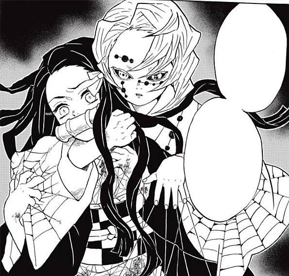 Tanjiro falls back to avoid Rui's attack but ends up losing sight of Nezuko, as he looks around to locate her, a splash of blood falls from the sky and he looks up in horror to see his sister bleeding and strung up in the threads. Rui nonchalantly demands that Tanjiro stop screaming and informs him that he will leave her to bleed in order for her to obey his will, threatening that he will leave her to disintegrate in the sun if she disobeys. When he looks into the sky, Rui notices that Nezuko has seemingly fainted or fallen asleep and notices an "odd feeling" resonating from Nezuko as opposed to his Demon family.