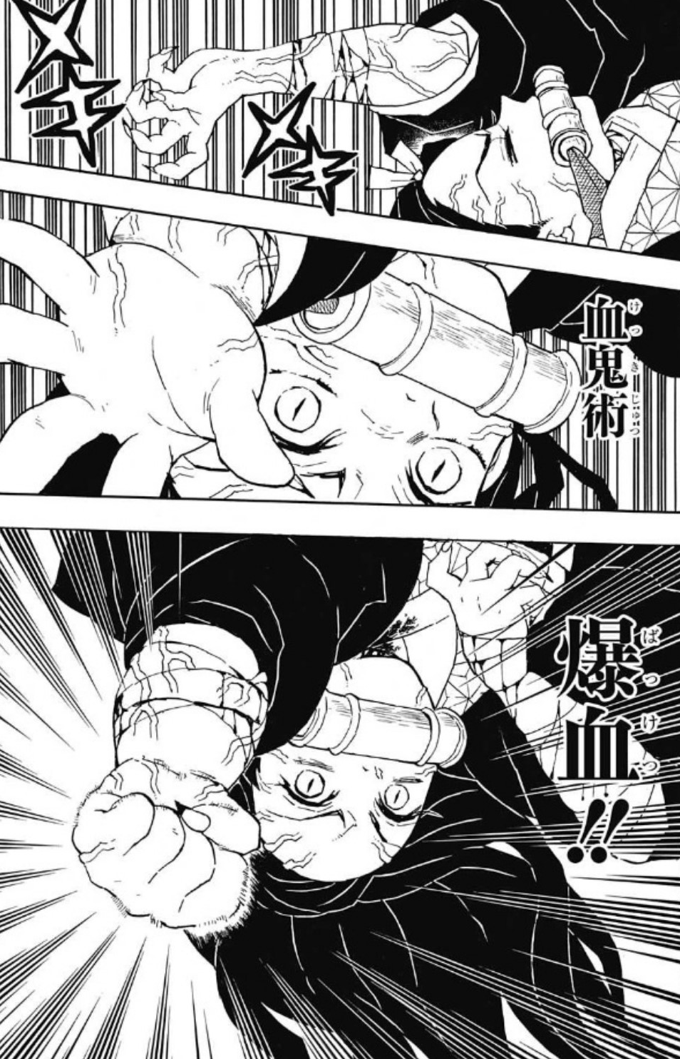 As the threads makes contact with Tanjiro's face, they burn away allowing his blade to reach Rui's neck. He nonchalantly dismisses Tanjiro's attempt at cutting his neck knowing that his body is stronger than his threads. However, with Nezuko's blood splattered onto Tanjiro's blade and the activation of her Blood Demon Art, the blade forcefully pushes through Rui's neck.