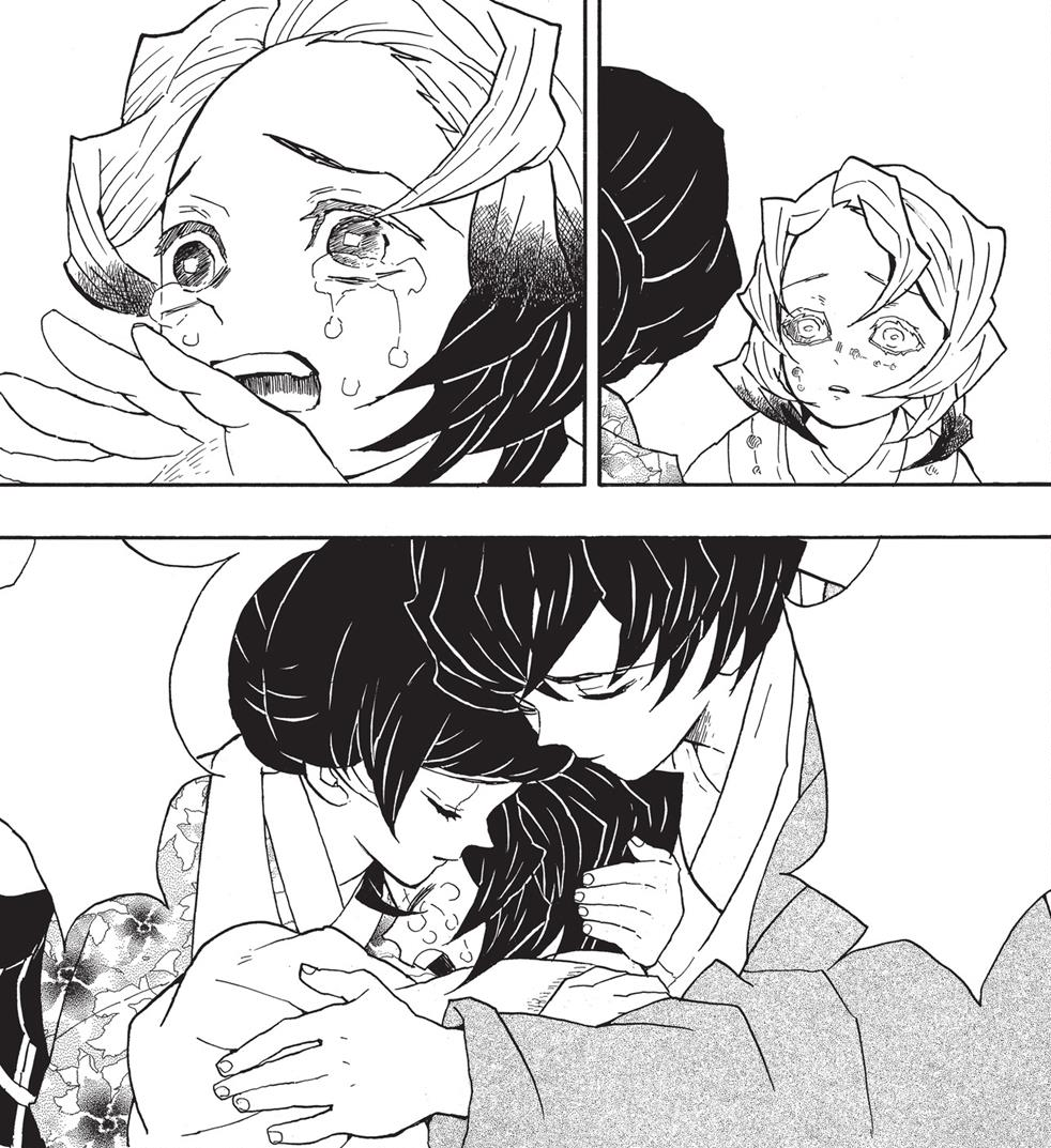 Giyu approaches the siblings, stepping on whatever is left of Rui's body, and reminds Tanjiro to not pity Demon's even if they have the appearance of a child. His remarks anger Tanjiro who reassures him that he will not have mercy on Demons, however he makes clear that he will not belittle the Demons who regret and repent their actions stating that they were once humans as well. Tanjiro proceeds to sternly ask Giyu to remove his foot from Rui's kimono.