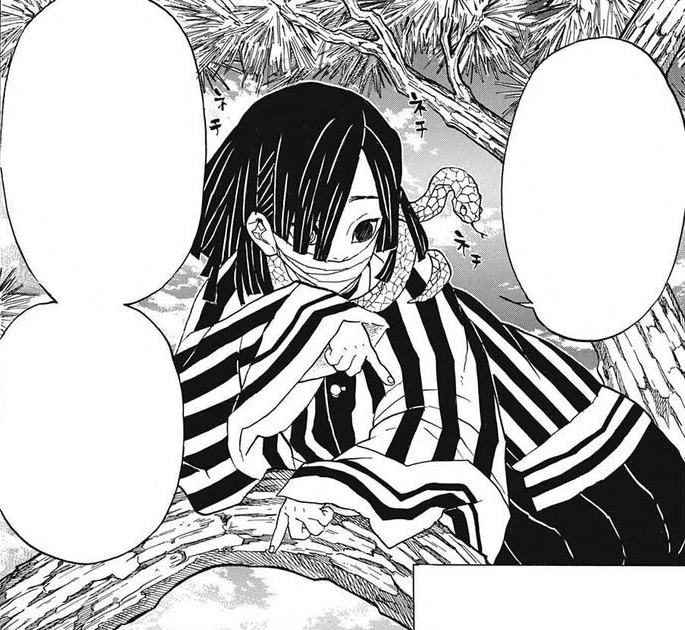 With the majority of the Hashira agreeing to decapitate Nezuko, Tanjiro is left rattled and desperately looks around for his sister. However, his train of thought is suddenly cut off when he hears a voice coming from above. He looks up to see a young man loitering in the tree above, who is introduced as the Serpent Hashira, Obanai Iguro. Obanai points at Giyu Tomioka and demands to know what his punishment will be for violating the Demon Slayer conduct. Shinobu mentions that they can think of Giyu’s punishment after they hear Tanjiro's reasoning for protecting a Demon.