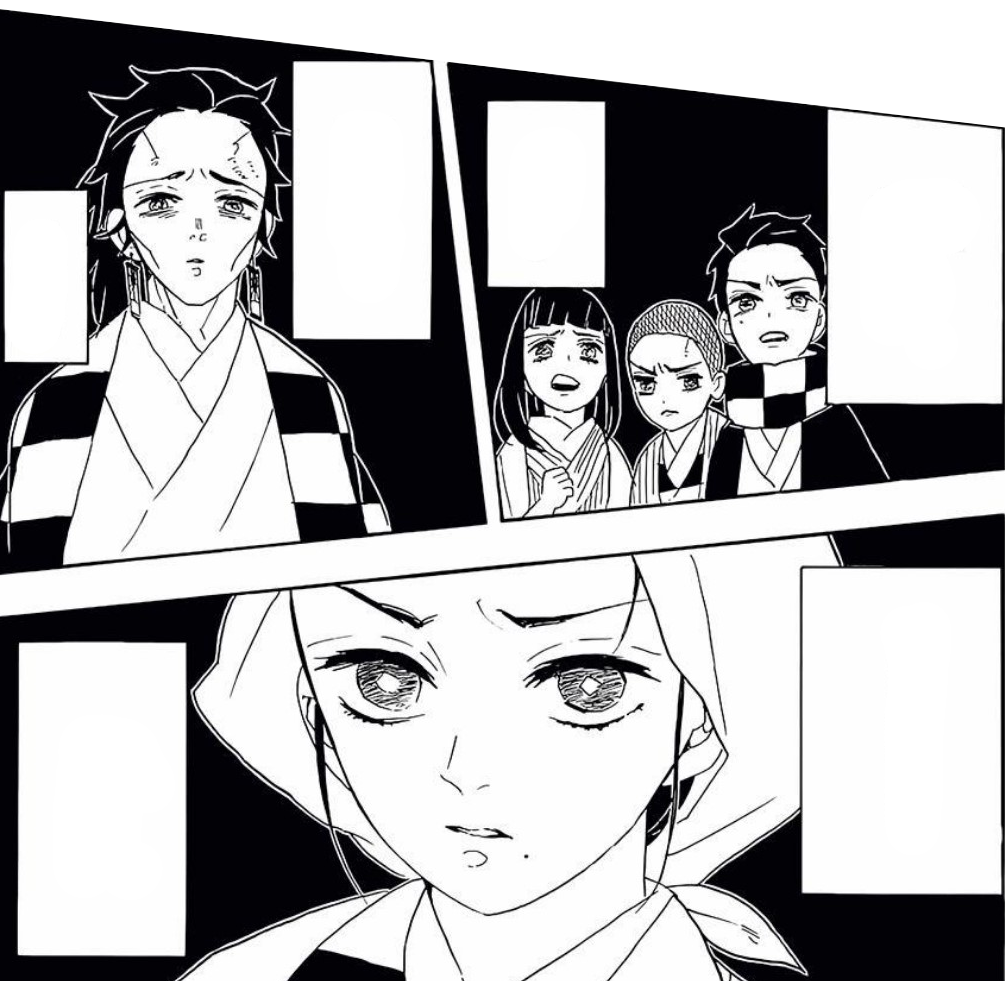 Puzzled as to why Tanjiro is not passing out, Enmu repeatedly attacks him with his Demon Art, only for Tanjiro to keep on instantaneously waking up and continuing his attack. Enmu acknowledges Tanjiro's grit to kill himself so many times even in a dream. Every time he was hit by Enmu's technique, he would see a nightmare where his family was chastising him, blaming him for their deaths and calling him useless.