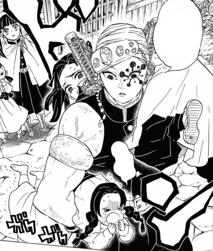 Following the completion of one of his solo missions, Tanjiro approaches the Butterfly Mansion to hear the screams of the young girls. Inside the property, Aoi and Naho scream to be let go after the Sound Hashira, Tengen Uzui begins to take them away while the other girls plea for their freedom. Aoi calls out for Kanao's help to save them, although she initially hesitates on what to do, Kanao chases after Tengen and grabs hold of Aoi and Naho.