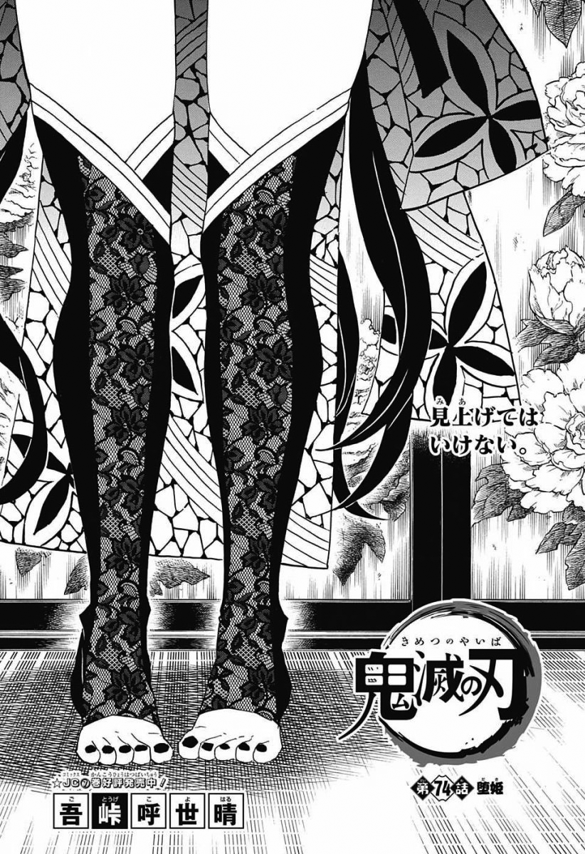 As Warabihime leaves the room, she has her doubts about Zenitsu and realizes that he isn't an ordinary human, and might possibly be a member of the Demon Slayers. In her cleaned room, she can be seen ominously laughing to herself as she openly welcomes the idea of Demon Slayers arriving to the district, promising she'll eat all of them. The chapter ends with Tanjiro looking into the night uneasily, as he comments on the "dark and murky" smell the town has at night.