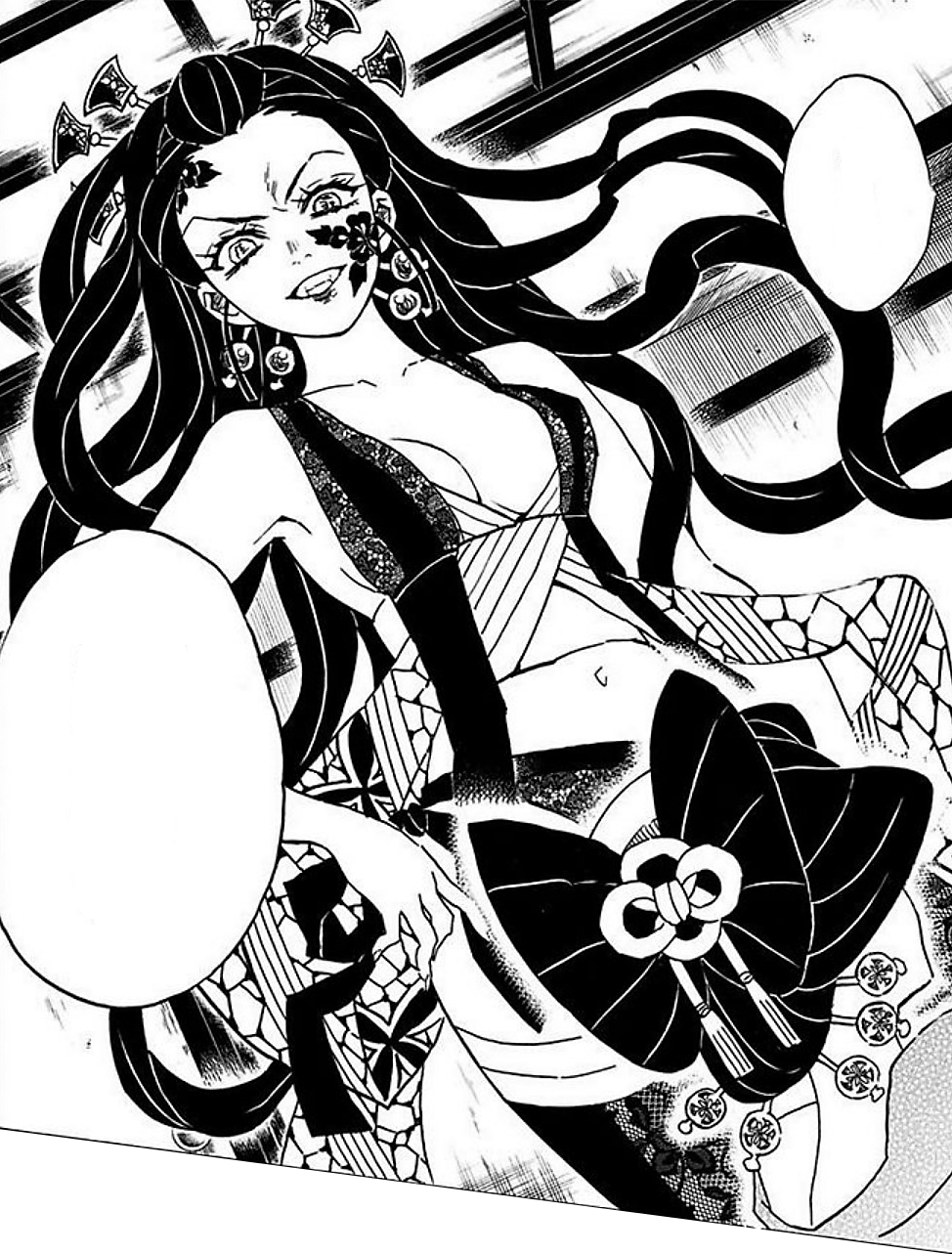 They wish each other well and say their goodbyes before Tanjiro leaves the room, but when Koinatsu hears a sound, she turns around to discover Daki standing right behind her. The chapter concludes with Tanjiro smelling the arrival of the Upper Rank Demon.