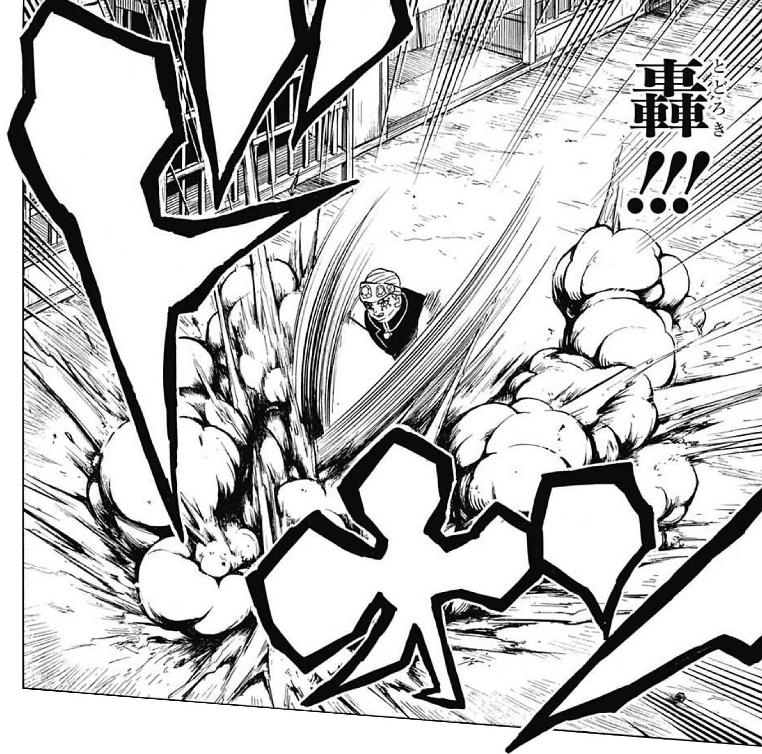As Tengen leaves the houses and heads back to the battlefield, he tries to listen for the sounds of the Demon and hears the vibrations coming from an underground cavern. He pulls out his blades and uses Sound Breathing: First Form - Roar to slam onto the floor causing a large explosion, which can be heard by Daki in the distance.