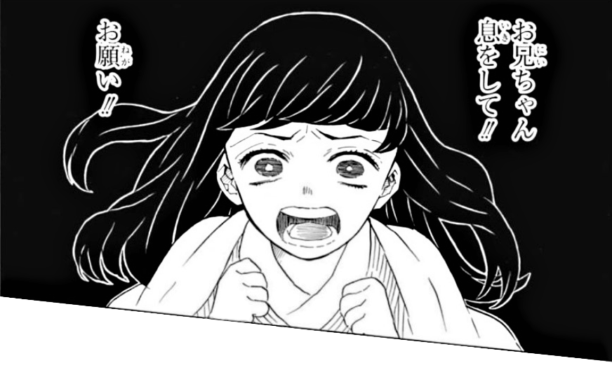 His flames burn the obi away, and within seconds he comes in to a close proximity to Daki. However just when he is about to decapitate her, Tanjiro envisions his sister Hanako desperately begging her brother to breathe. In that moment Tanjiro loses his focus and begins gasping for air after nearly passing his physical limitations. He collapses onto the ground, finally feeling the pain that he had been suppressing, and his eyes begin to bleed. It is revealed that he had been acting on anger and had been using his "life force" to surpass his limitations, however his sister was able to warn him before he could sustain any life-threatening damage.