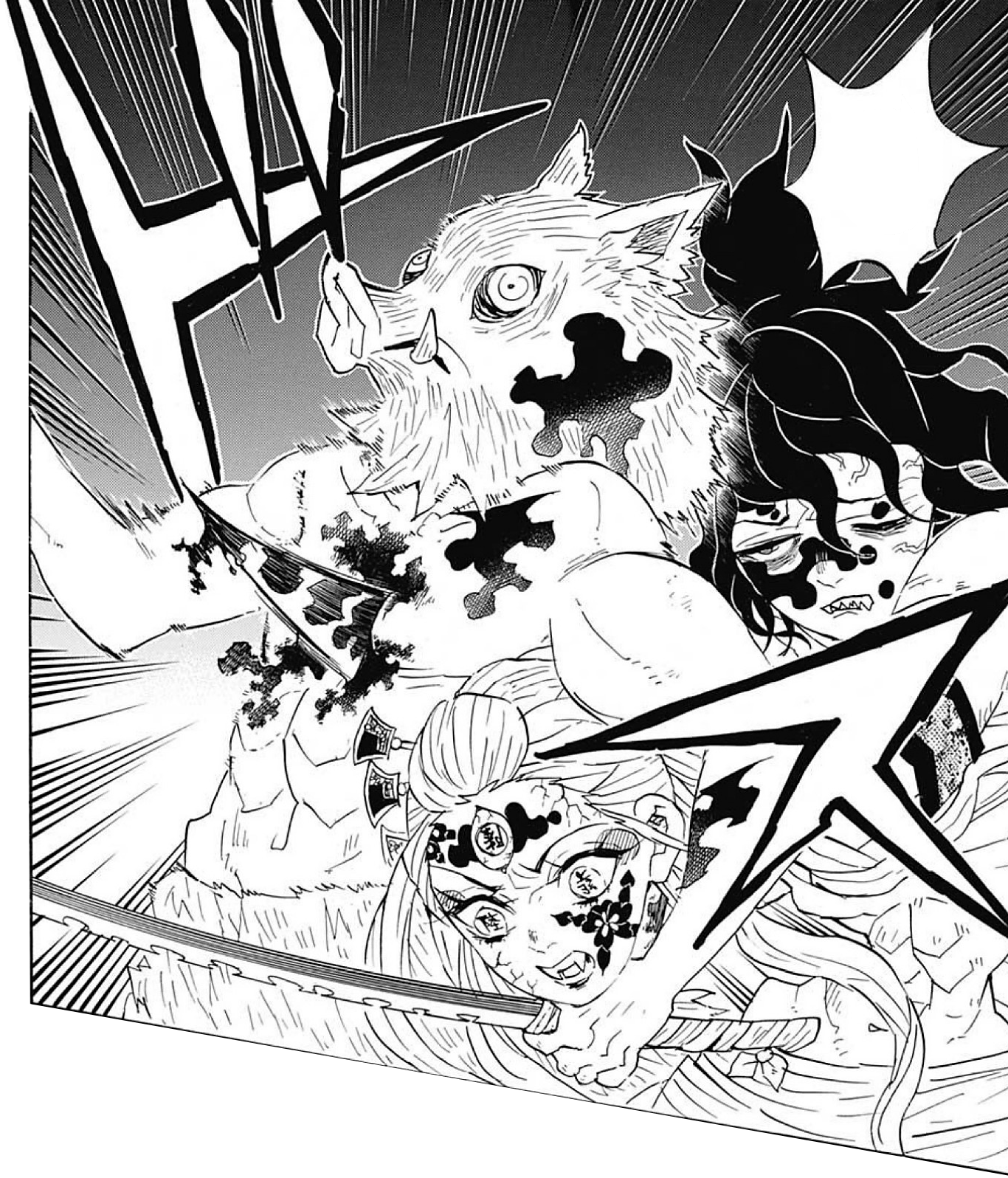Having successfully decapitated Daki, Inosuke can be seen escaping with her head in order to prevent her from reattaching it to her body. He tells the other boys not to worry about him and to instead help Tengen, but before he can get to safety, Daki uses her hair to put up a resistance.