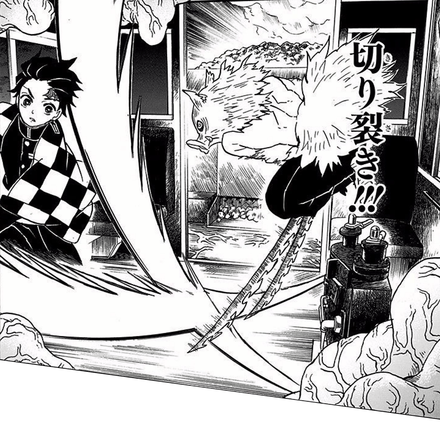 Tanjiro panicking, immediately tries to go back to the passengers to defend them despite him stating that he can only protect two carriages at best. He shouts Kyojuro and the others, begging them to wake up in order to defend the passengers. Suddenly, a faint noise keeps building up from inside the Infinity Train, that being Inosuke Hashibira screaming his catchphrase "PIG ASSAULT!!!". Filled with relief but seriousness soon after, Tanjiro tells Inosuke to take care of the passengers coming to the latter's frustration due to his dream. Inosuke then jumps back into the crevice that he created and unleashes his Beast Breathing: Fifth Fang - Crazy Cutting wanting admiration from the passengers when they wake up, as Tanjiro goes to another carriage through a window he cuts off one of the fleshy ingrowths with the Water Breathing: First Form - Water Surface Slash.