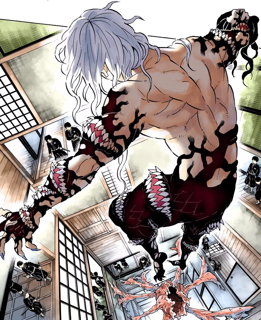 Suddenly, Muzan emerges from his flesh cocoon with a brand new appearance, his hair being far longer and being silver white due to his accelerated aging. He also has numerous jaws all over his body with sharp white fangs used to consume human flesh and blood, and is holding Tamayo's disembodied head on his right hand. Muzan massacres the dozens of Demon Slayers currently within his vicinity as they try to retreat from his location. Kiriya attempts to order them through a Crow for them to fall back. However, Muzan murders and consumes all the Demon Slayers within their groups and beheads the Kasugari Crow that gave the orders to retreat.