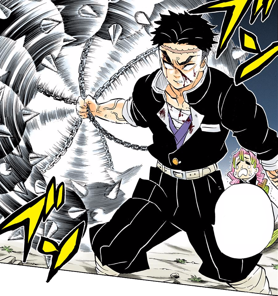 The Hashira dodge Muzan's attacks and retaliate the Demon lord with Obanai using the Serpent Breathing: Third Form - Coil Choke, Mitsuri using her Love Breathing: Second Form - Love Pangs and Giyu using the Water Breathing: Eighth Form - Waterfall Basin. Obanai was able to slash his Nichirin Blade past Muzan's neck, but to no avail as the moment his blade cuts Muzan's neck it regenerates instantaneously. This confuses Mitsuri to the point where she doubts that Muzan is not being cut down, whereas Giyu knows that Muzan is being cut but regenerates his wounds instantly. Muzan finds this the perfect opportunity to strike and kill all the Hashira. Just as the Hashira were about to be mauled by Muzan, dozens of Demon Slayers come and sacrifice themselves to save the Hashira.