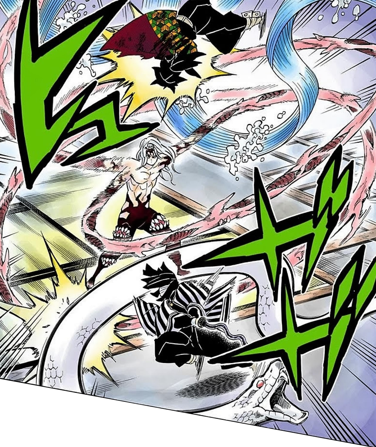 Tanjiro can not believe that he has never felt this cold towards a living being once in his life. He points out from Gyomei's explanation that Muzan cannot die from decapitation, from this he tries to figure out how they can expose Muzan Kibutsuji to the sun. The problem being that they have no clue on how to bring Muzan out of the Infinity Castle. Muzan immediately transforms his arms into long spiked tendrils that function like whips and flails them at both Tanjiro and Giyu. Giyu uses the Water Breathing: Eleventh Form - Dead Calm in order to repel the flailing tendrils but gets cut in many places in his body along with Tanjiro. Tanjiro notes that Muzan's attacks are unbelievable in destructive power and lethality, as he is only dodging by instinct alone.
