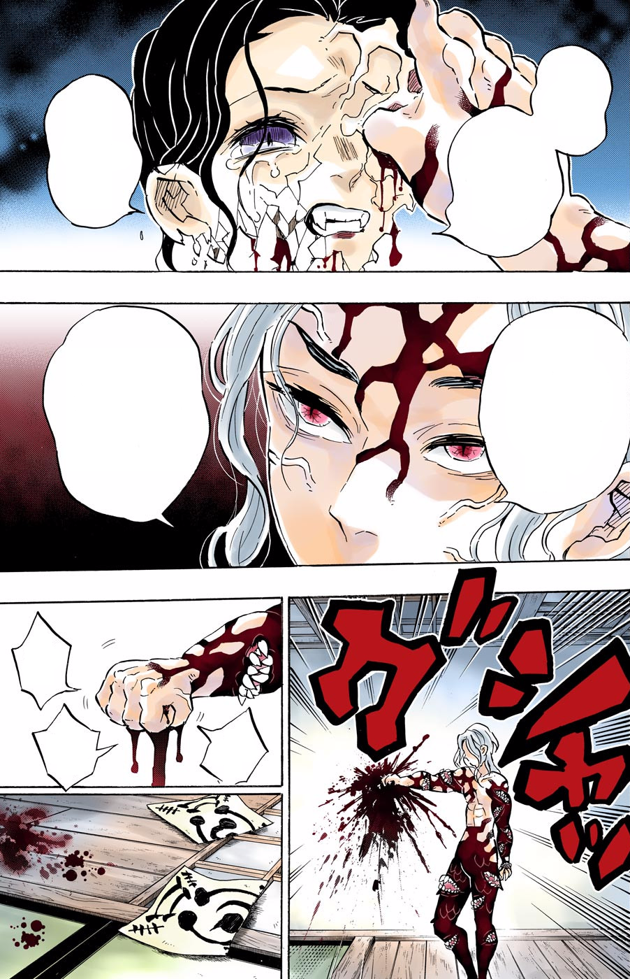 Mitsuri believes that her Love Breathing attack harmed Muzan in some way, but the demon lord is completely unscaffed, coming to her surprise. Obanai appears helping Tanjiro get back up and tells him to back out of the fight if he keeps getting knocked down. Tanjiro is relieved to see Obanai and Mitsuri alive, while Muzan is both confused and livid at the fact the two Hashira that Nakime supposedly killed are still alive. Muzan shouts Nakime's named and demands her what she is doing at that moment, with Yushiro placing his Blindfold technique in front of her singular eye along with his fingers jammed into her skull possibly touching her nerves to command the Infinity Castle upwards towards the surface. Yushiro with his eyes blood red tells that Muzan has committed the gravest sin in the world, taking Tamayo away from him. This makes Yushiro scream in grief telling him to repent immediately and that he will be erased from the face of the earth.