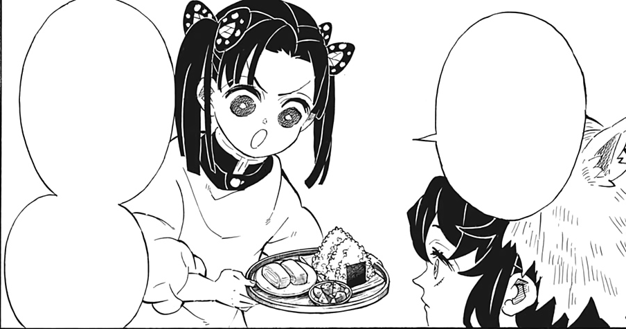 Shinobu quickly learns to manipulate Inosuke in a similar fashion to Tanjiro, figuring out that she can convince him to undertake any task by second-guessing his ability to do so. Inosuke initially shows his usual abrasive and disrespectful