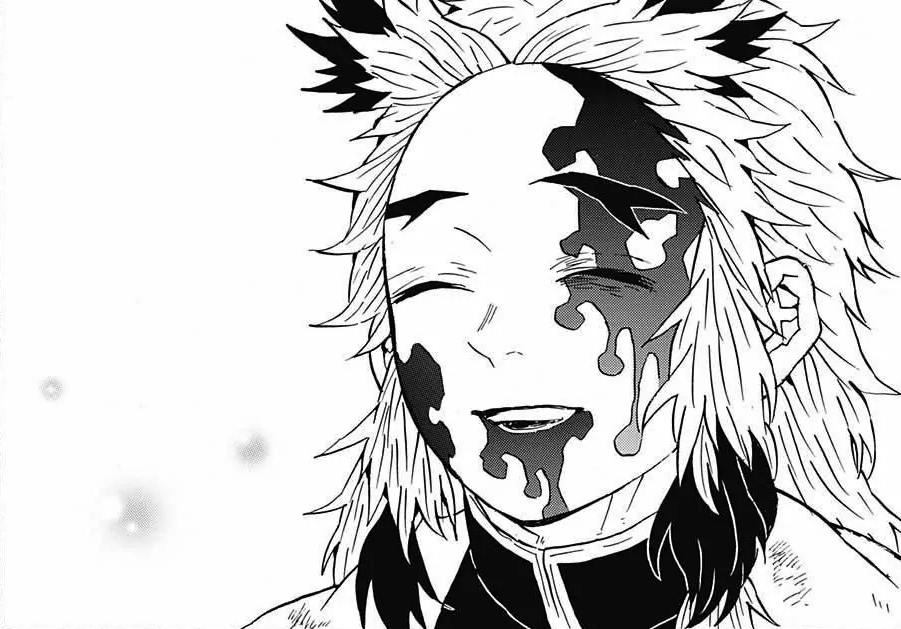 Tanjiro lets out a final scream and collapses to his knees, crying, and Inosuke starts to shake. Kyojuro looks over at him and smiles, telling Tanjiro to come over to him so they can have a final chat before he dies.[32]