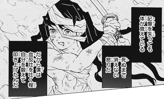 While Amane continued to visit the twins, Yuichiro chased her away each time. In the following summer when the twins were eleven, a Demon arrived at their cabin during the night and attacked, resulting in Yuichiro losing his left arm while trying to protect Muichiro. As the Demon badgered them for their worthlessness, Muichiro lost himself in a rage and destroyed the Demon with all the tools at their disposal and wooden logs.[4]