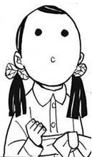 Sumi has light skin and a set of black, button-like eyes. She wears her hair in low twintails fastened with blue butterfly clips.