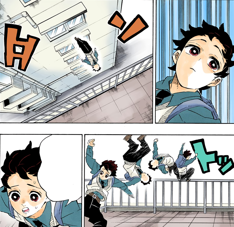 Sumihiko runs past a pair of old men sitting and playing shogi in a traditional Japanese-style house, the doors open, and the shorter Jigoro-lookalike man asks what's with him every morning. Sumihiko apologizes to them as the man mutters that he's a hooligan, and continues to run down the street, passing three young girls who laugh and exclaim that he's the "running man." Embarrassed, he blushes at the nickname as he passes a police patrol car manned by two officers who bear a resemblance to the Shinazugawa brothers. Sumihiko flips himself over the hood of the car, muttering an apology to the officers, then sprints past a group of kids who look like Giyu Tomioka, Sabito and Makomo who are exchanging kitsune mask-like collectible toys.[5]
