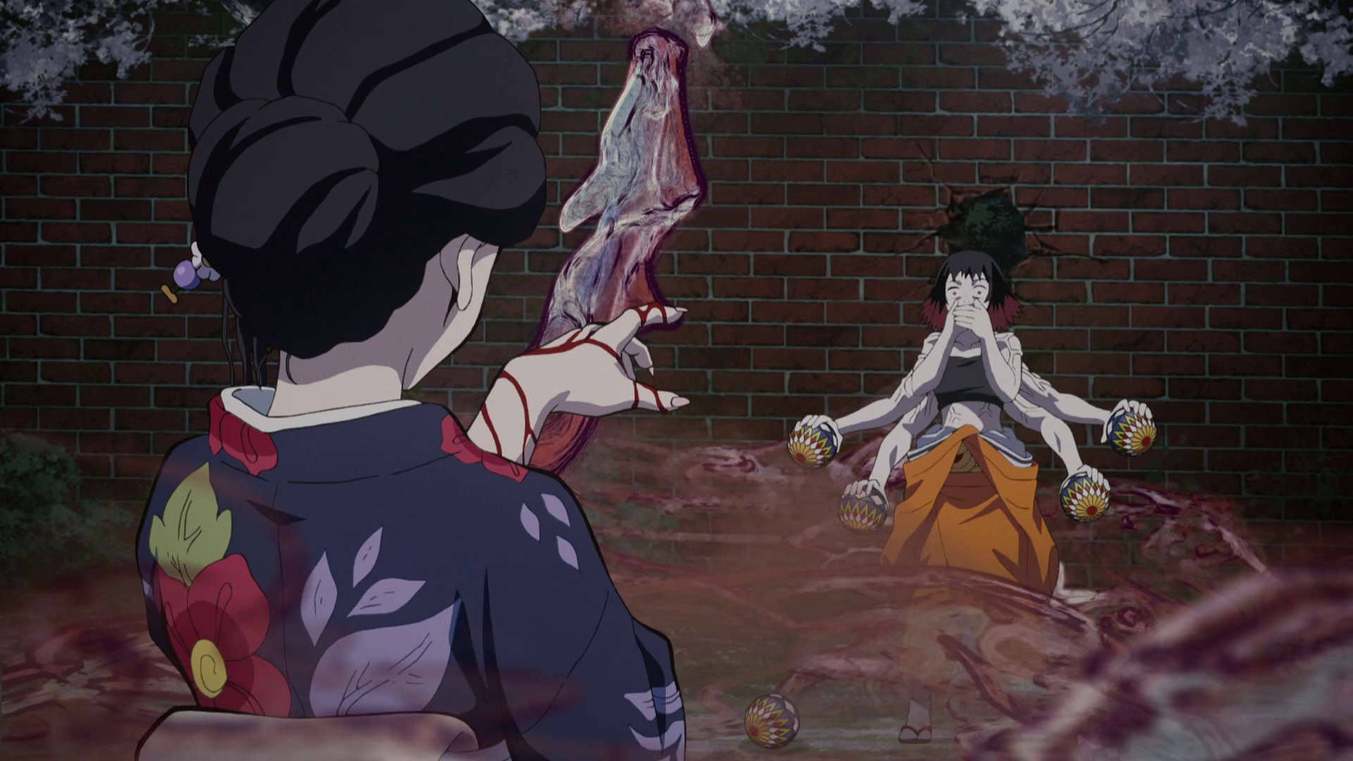 Susamaru is impressed Tanjiro stabbed the temari at a curve to soften the blow. However, the temari can still move and flies off of Tanjiro's sword. Yushiro slowly regenerates his head and tells Lady Tamayo this is all Tanjiro's fault for blowing their cover. Yushiro says he'll never forgive the Demons for hurting Lady Tamayo. This amuses Susamaru, who takes off her kimono and grows four more arms. Wielding six temari this time, she promises to play with her new friends until they die.[9]