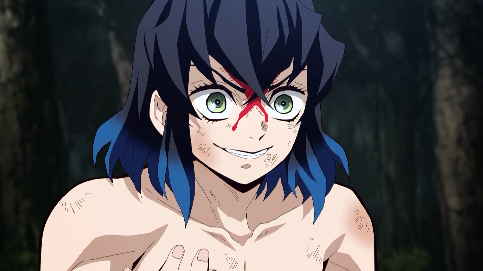Tanjiro and Zenitsu look at the boy in shock as they see his feminine face, and he proceeds to grow irritated as they stare at him. The boy yells at Tanjiro to headbutt him again so they can continue the fight, but Tanjiro refuses and tells him to sit down. The boy tells Tanjiro that his name is Inosuke Hashibira, but when asked how his name is written, he reveals that he doesn't know how to read or write.[5]Inosuke unexpectedly stops speaking and everyone watches him to see what he'll do next. However, his eyes proceed to roll back and he falls unconscious on the ground.